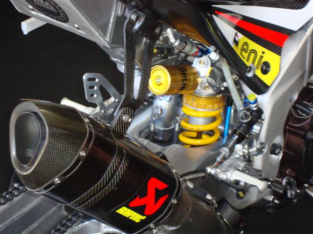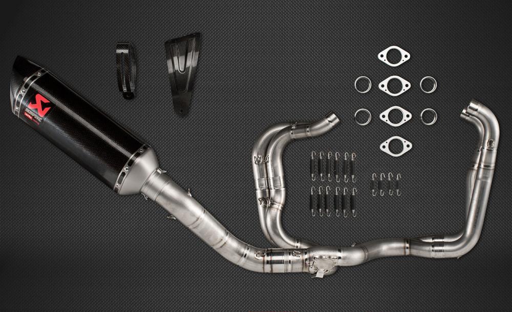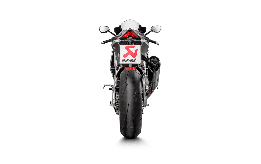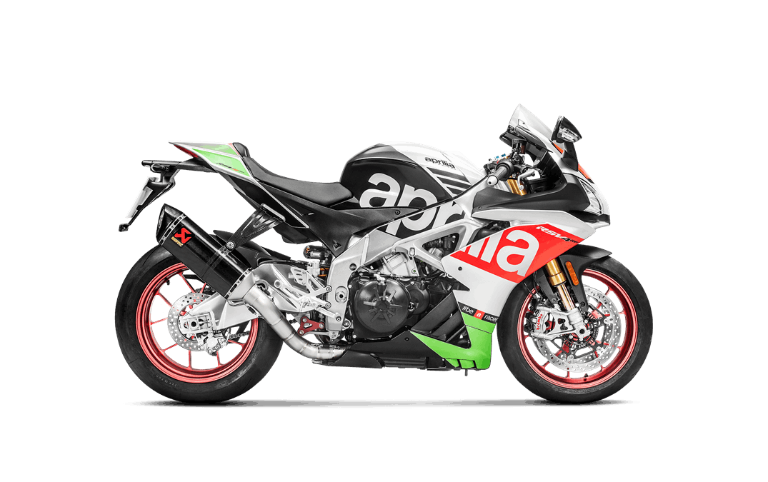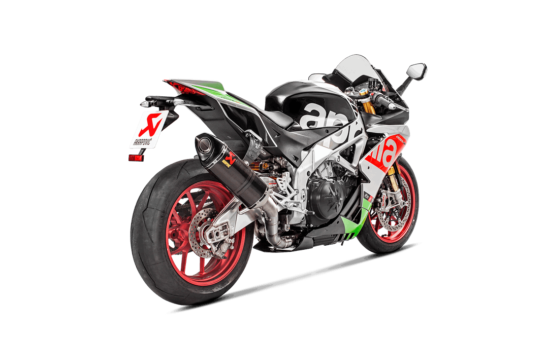 The combination of race-proven, lightweight materials, exceptional production quality, perfect design, amazing sound, and top performance makes this exhaust a must-have for discerning riders that demand the best. It is constructed with a carbon-fibre muffler outer sleeve and end cap, with a fully titanium link pipe and inner muffler structure, matched to high-grade titanium alloy for the headers and collectors, resulting in a full system that is 44% lighter than stock. Developed for use on closed-course competition circuits, this racing track–oriented system requires mandatory remapping and removal of the passenger footrest. It delivers increases of power and torque of 4.0 kW (5.4 hp) at 13,000 rpm and 3.8 Nm at 7,700 rpm when measured in back-to-back comparisons against an Aprilia RSV4 with a standard stock system on the in-house dyno. This race-developed system delivers a distinctive deep, sporty sound, perfectly endorsing the Akrapovič character.