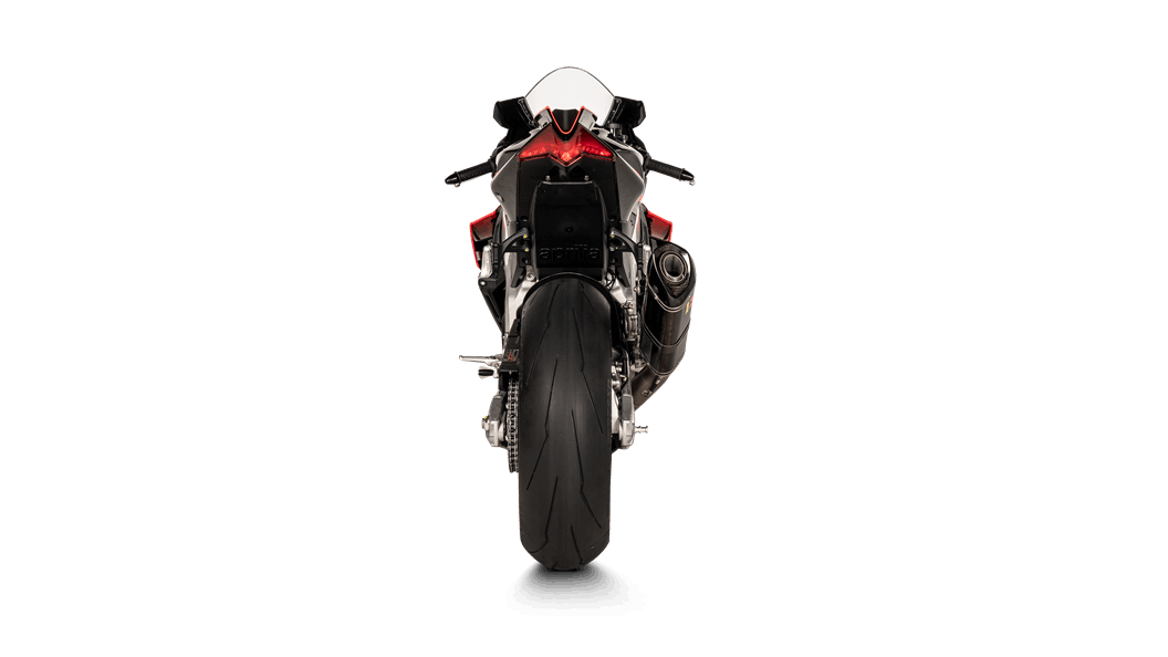 Race-proven materials and sporty design have led to an exhaust that is the perfect introduction to the exhaust tuning process. The carbon-fibre muffler outer sleeve and end cap are stylishly shaped for a visual impact, and the use of lightweight titanium for the link pipe and inner structure means this system weighs in at 3.5 kg lighter than stock, for an impressive savings of 62.4%. This exhaust has been developed for use on closed-course competition circuits, and it delivers track performance to match that demand. Power is increased by 3.6 kW (4.9 hp) at 13,000 rpm and torque up by 4.5 Nm at 7,600 rpm when compared in back-to-back tests on the Akrapovič dyno with an Aprilia RSV4 with a standard stock exhaust. To match the performance and style, the Slip-On Line (Carbon) system serves up a deep and vivid sound, full of Akrapovič character, to totally encapsulate the Aprilia engine.