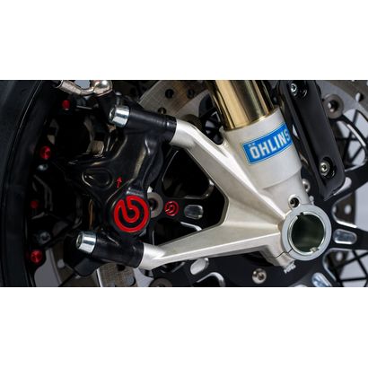 Finishing of the caliper is obtained with an anthracite black hard oxidation treatment. The pair of calipers comes in a kit that includes: pre-mounted sintered brake pads, specific instruction sheet and a pair of Brembo stickers.