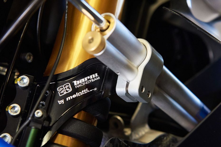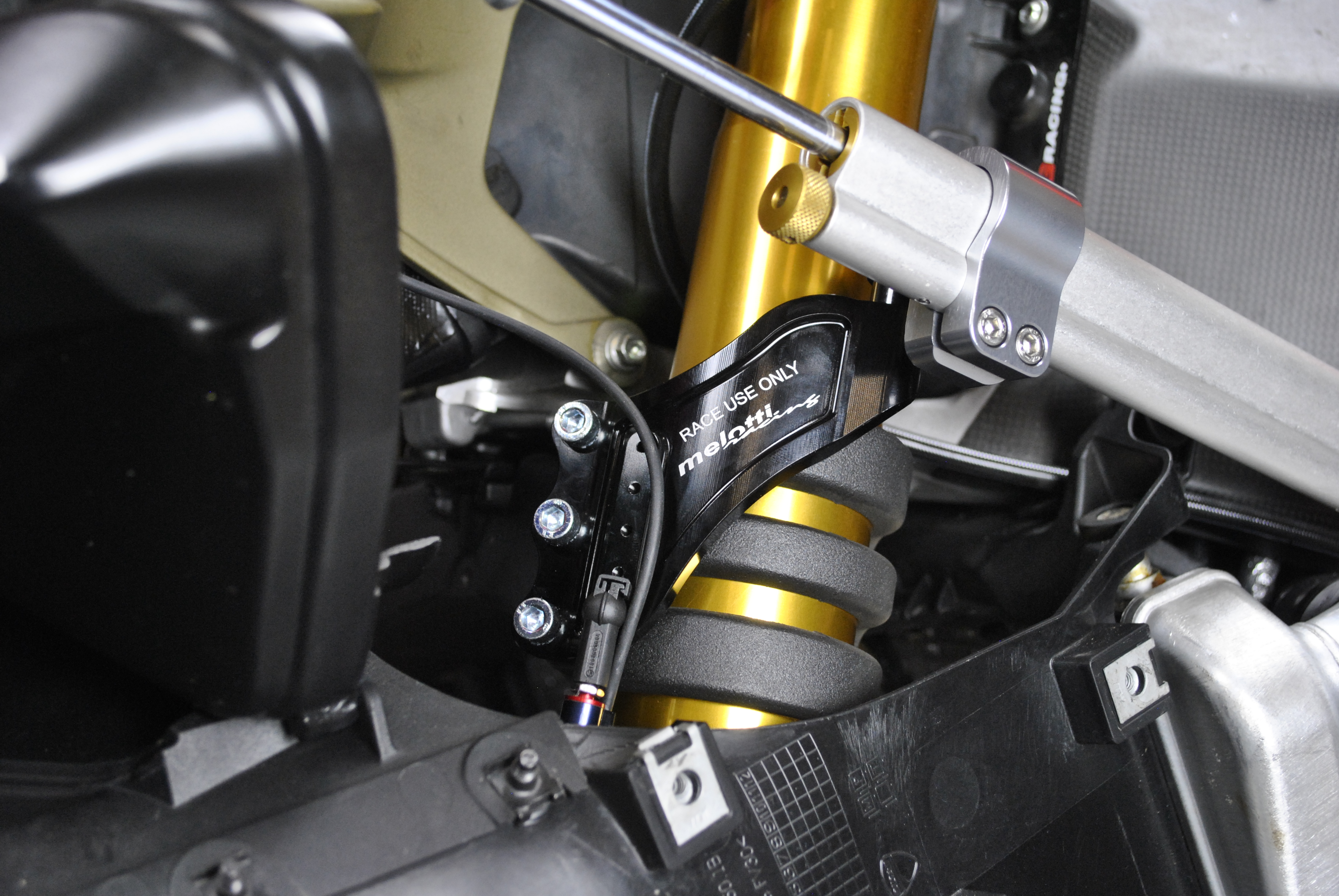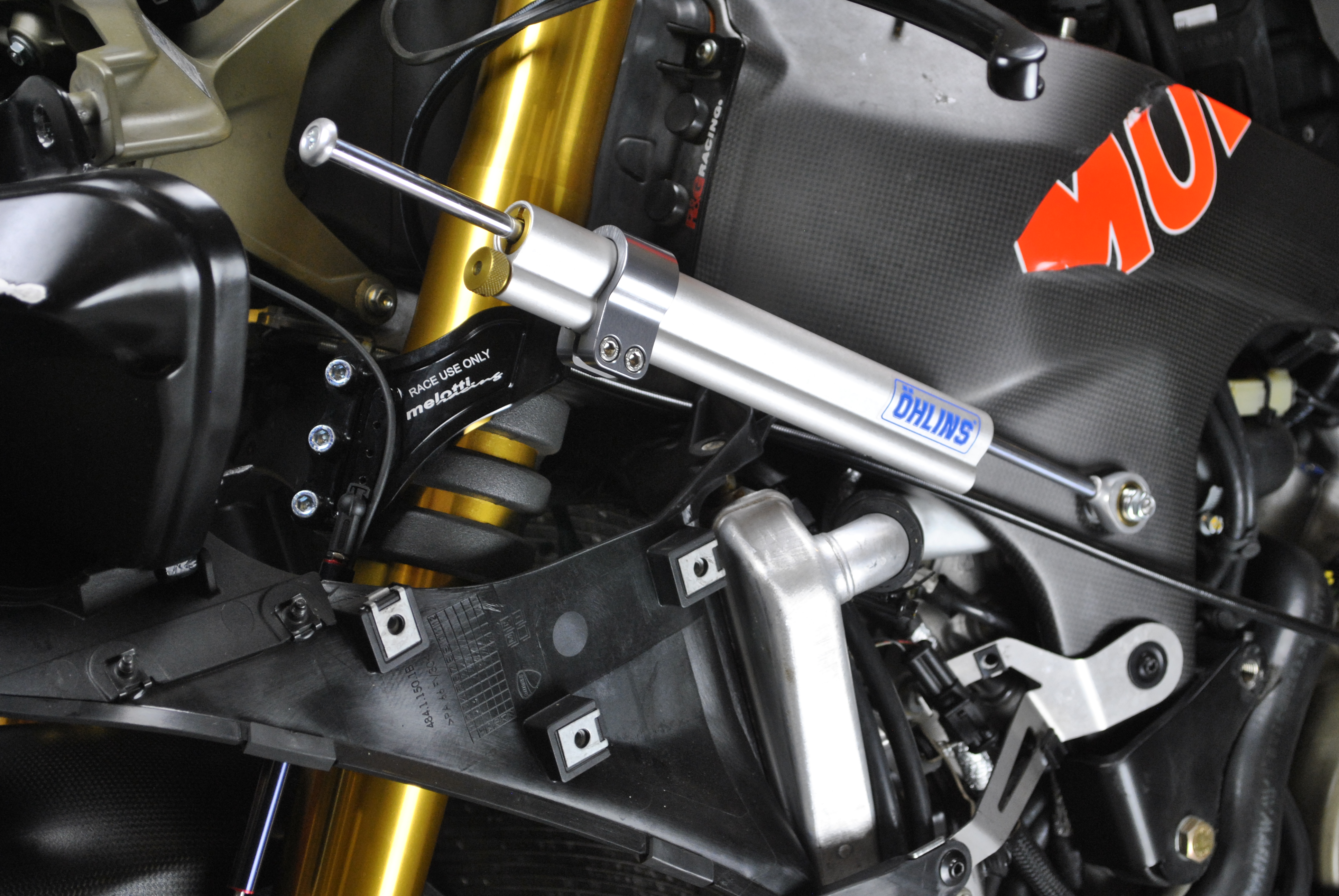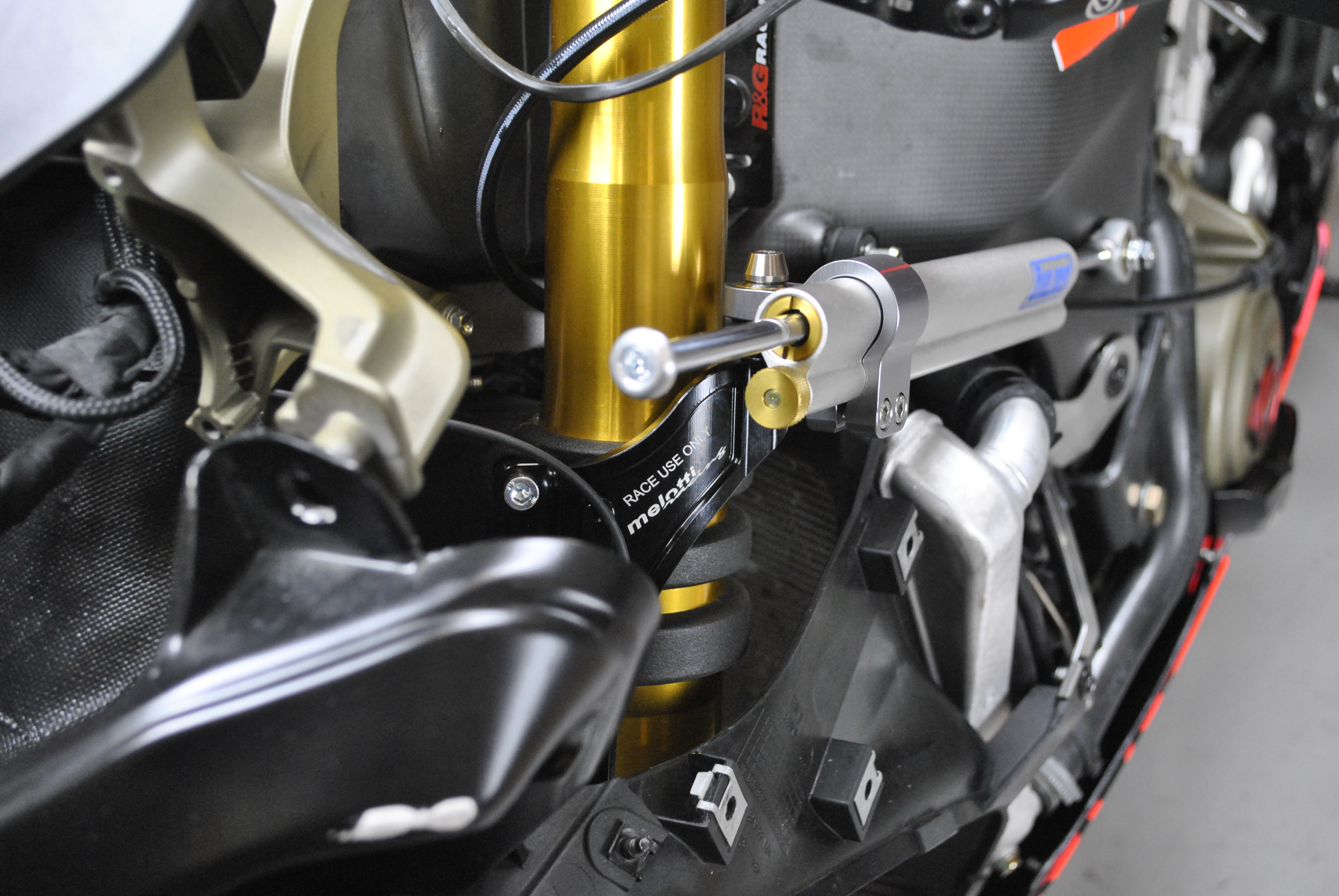 The use of the side steering damper is a must on all professional race bikes because the hydraulic response is in fact faster, more precise, and progressive. The advantages of the lateral position damper help control the of front chassis better and allow for greater stroke. The damper in the side to side position has better feel and travel making it more useful in the event of a tank slapper compared to the traditional mounting location.